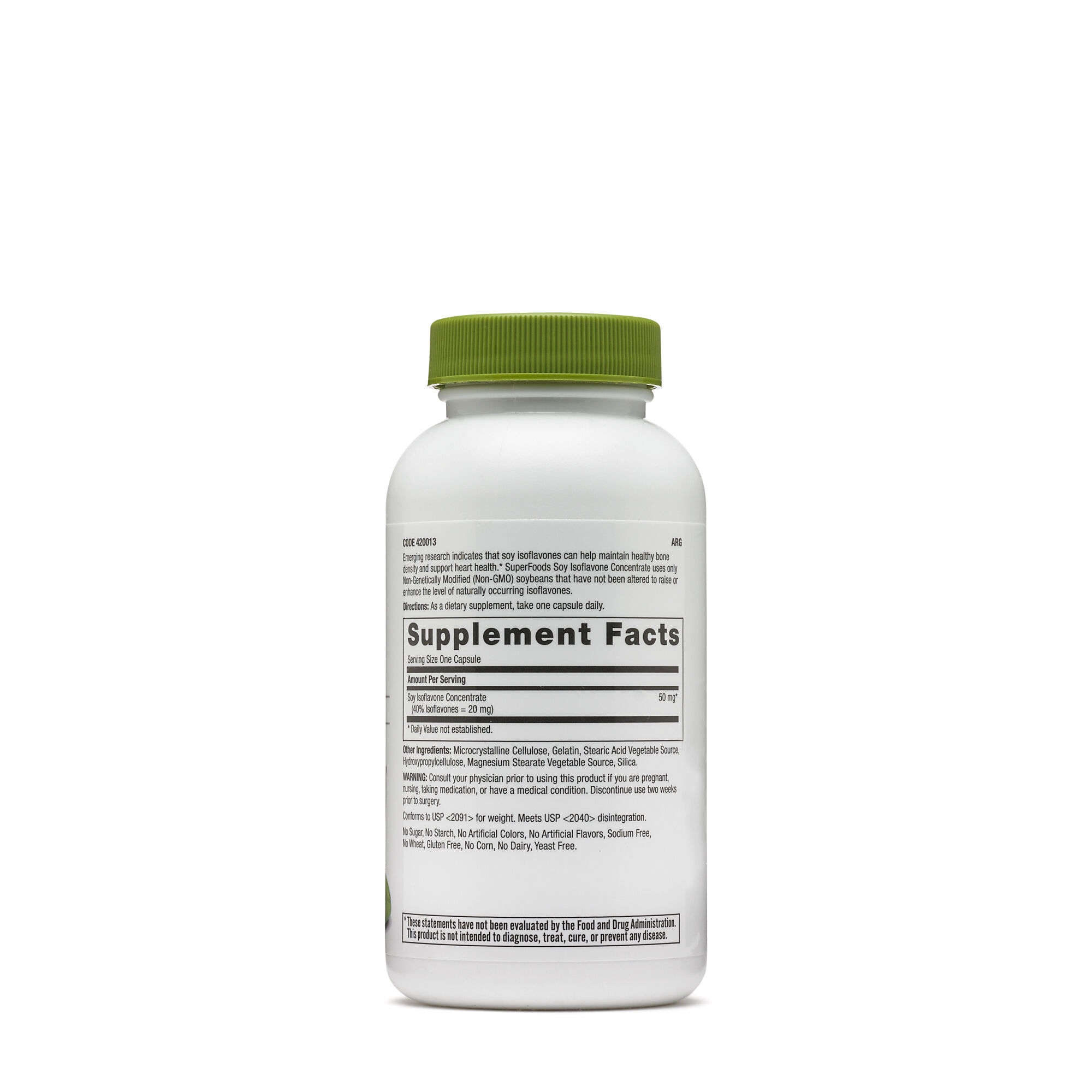 GNC SuperFoods Isoflavone din Soia Mod de administrare: Ca supliment alimentar, administrati 1 capsula pe zi. Portie de servire: 1 capsula Portii per flacon: 90 Compozitie / portie Cantitate %VNR Concentrat de izoflavonoide din soia (40% izoflavone = 20 mg) 50 mg * *Valoarea nutritionala de referinta nu a fost stabilita. Alte ingrediente: celuloza microcristalina, gelatina, acid stearic din sursa vegetala, hidroxipropilceluloza, stearat de magneziu din sursa vegetala, siliciu. Atentionari: A se consulta un medic specialist inainte de a consuma acest produs in caz de sarcina, alaptare, daca urmati un tratament medicamentos sau suferiti de o afectiune medicala. Intrerupeti administrarea cu doua saptamani inaintea oricarei interventii chirurgicale. Produsul este un supliment alimentar si nu trebuie sa inlocuiasca o dieta variata si echilibrata si un stil de viata sanatos. A nu se lasa la indemana si la vederea copiilor mici. A nu se depasi doza recomandata pentru consumul zilnic. Nu contine: zahar, amidon, coloranti artificiali, arome artificiale, sodiu, grau, gluten, porumb, lactate, fermenti, organisme modificate genetic. KO – Certificat Kosher Vegetarian. Conditii de pastrare: In flaconul original, la loc uscat si racoros. Termen de valabilitate: Vezi data mentionata pe ambalaj. Producator: General Nutrition Corp. Pittsburgh, PA 15222, USA. Fabricat in: USA
