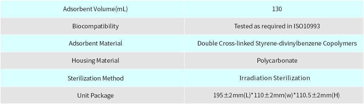 Cartușul de hemoperfuzie de unică folosință are caracteristicile capacității specifice de recunoaștere și adsorbție a substanțelor patogene. În clinică, acest produs poate fi utilizat nu numai independent, ci și combinat cu alte dispozitive de purificare a sângelui pentru adsorbția sângelui complet sau pentru schimbul de plasmă pentru a îndepărta complet substanțele patogene endogene și exogene de dimensiuni medii până la mari, precum medicamentele reziduale, toxinele și substanțe metabolice din sângele pacienților.