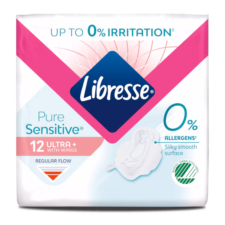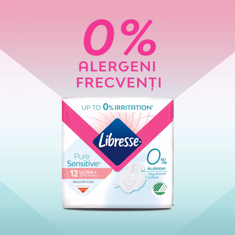 Libresse Pure Sensitive™ Ultra cu aripioare sunt special create pentru pielea sensibilă, având un strat superior delicat care ajută la reducerea iritațiilor – până la 0% disconfort, oferindu-ți protecție completă și blândă cu pielea.