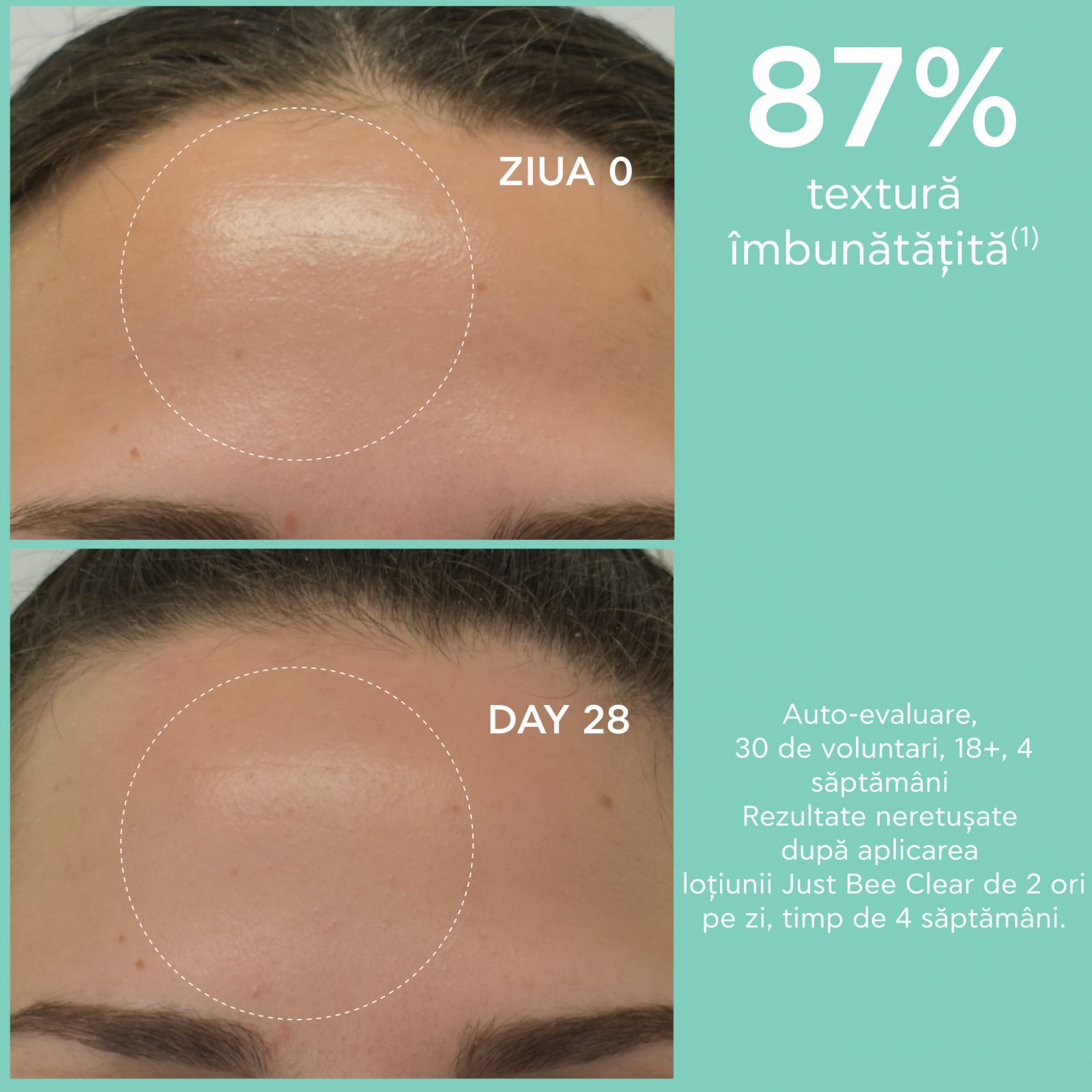 Loțiunea Just Bee Clear se adresează tenului gras și acneic lăsând pielea purifiată, cu aspect redefinit și matifiat.