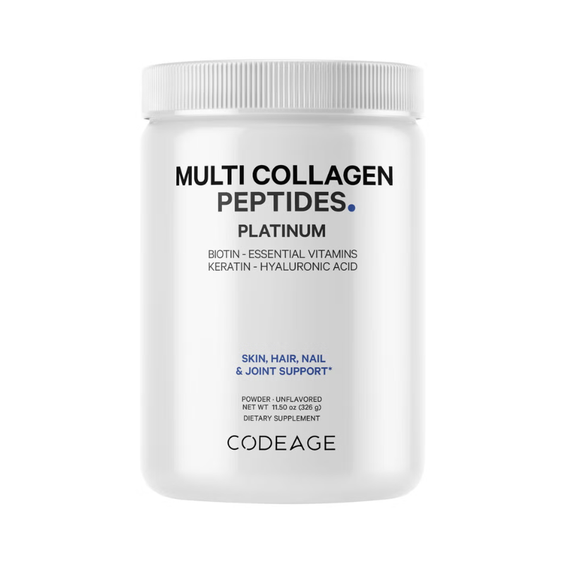 CodeAge Platinum Multi Collagen Peptides, Peptide de Colagen cu Biotina, Keratina si Acid Hialuronic Codeage Multi Collagen Platinum este o formula premium de colagen sub forma de pulbere fara aroma, care combina 5 tipuri de peptide de colagen (tip I, II, III, V si X) cu biotina 10.000 mcg, keratina hidrolizata, acid hialuronic si un complex de vitamine esentiale precum vitamina C, vitamina D3, vitamina B6, niacina si acid pantotenic. Colagenul este obtinut din 5 surse de calitate superioara si contine 18 aminoacizi, oferind un suport nutritiv complet pentru sanatatea pielii, parului, unghiilor, articulatiilor si oaselor. Aceasta formula all-in-one este special conceputa pentru femei si barbati si poate fi adaugata usor in cafea, ceai, smoothie-uri, shake-uri proteice sau bauturi calde si reci. Beneficii: 5 tipuri de colagen pentru sustinerea pielii, articulatiilor, oaselor si unghiilor Cu biotina 10.000 mcg si keratina hidrolizata pentru par sanatos si rezistent Acid hialuronic si vitamina C pentru hidratarea si elasticitatea pielii Este non-GMO, fara gluten, lactate, soia, crustacee sau ingrediente artificiale Potrivit pentru femei si barbati; usor de integrat in rutina zilnica. Fabricat in SUA intr-o unitate certificata cGMP, pentru garantarea calitatii si sigurantei produsului. *Produsul este un supliment alimentar si nu trebuie sa inlocuiasca o dieta variata si echilibrata si un stil de viata sanatos.