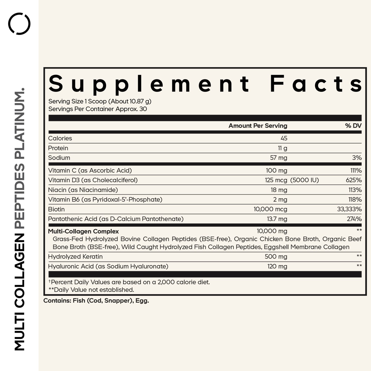 CodeAge Platinum Multi Collagen Peptides, Peptide de Colagen cu Biotina, Keratina si Acid Hialuronic Mod de administrare: se recomanda ca adultii sa amestece o cupa zilnic de pudra Codeage Multi Colagen Platinum Edition cu 240 ml de bautura, cafea, smoothie sau gustare preferata pentru a va imbunatati dieta. Nu depasiti doza recomandata zilnic. Portie de servire: 1 cupa (aprox 10.87 g) | Portii per recipient: aprox. 30 | Cantitate neta: 326 g Compozitie / portie de servire Cantitate %VNR Calorii 45 Proteina 11 g 22%** Sodiu 57 mg * Total grasimi 0 g 0%** Acizi grasi 0 g 0%** Vitamina C (acid ascorbic) 100 mg 125%** Vitamina D3 (colecalciferol) 125 mcg (5000 UI) 2500%** Niacina (niacinamida) 18 mg 112.5%** Vitamina B-6 (fosfat-5’-piridoxal) 2 mg 142.86%** Biotina 10000 mcg 20000%** Acid pantotenic (d-pantotenat de calciu) 13.7 mg 2228.33%** Complex multi colagen Peptide din colagen hidrolizat din bovine (fara ESB), fiertura organica din os de pui, fiertura organica din os de vita (fara ESB), peptide din colagen hidrolizat din peste salbatic, colagen din membrana din coaja de ou 10000 mg * Keratina hidrolizata 500 mg * Acid hialuronic (hialuronat de sodiu) 120 mg * *Valoarea nutritionala de referinta nu este stabilita. **Valoarea nutritionala de referinta, conform Reg UE, nr 1169/2011. Profilul tipic al aminoacizilor (cantitatea medie per portie de sevire ce apare in mod natural poate varia) Alanina 867 mg Hidroxilizina 85 mg Fenilalanina** 189 mg Arginina 737 mg Hidroxiprolina 1234 mg Prolina 1354 mg Acid aspartic 558 mg Izoleucina** 149 mg Serina 325 mg Acid glutamic 979 mg Leucina** 285 mg Treonina** 177 mg Glicina 2334 mg Lizina** 358 mg Tirozina 50 mg Histidina** 73 mg Metionina** 86 mg Valina** 220 mg **Aminoacizi esentiali Contine 8 din 9 aminoacizi esentiali. Ingrediente: complex multi-colagen, biotina, keratina hidrolizata, acid hialuronic, vitamina C, niacina, acid pantotenic, vitamina B-6, vitamina D3, capsula din metilceluloza,palmitat de ascorbil , dioxid de siliciu, celuloza microcristalina. Contine: peste (cod, snapper), oua. Atentionari: Produsul este un supliment alimentar si nu trebuie sa inlocuiasca o dieta variata si echilibrata si un stil de viata sanatos. Daca sunteti insarcinata, alaptati, alergic, aveti o afectiune medicala sau administrati un tratament medicamentos, consultati un medic specialist inainte de a utiliza acest produs sau orice alt supliment alimentar. Utilizati doar ca supliment alimentar. Nu utilizati pentru scaderea in greutate. Culoarea sau mirosul produsului poate varia de la lot la lot. Nu utilizati daca ambalajul a fost deschis sau avariat. Niacina poate cauza o reactie temporara de inrosire a fetei. Informati medicul de continutul de biotina al produsului inainte de orice test de laborator. A nu se lasa la indemana sau la vederea copiilor. Nu este o sursa semnificativa de proteine. Proteina din colagen nu apare in procentul valorii proteice de referinta datorita lipsei din compozitie a unui aminoacid esential: triptofan. Nu contine: organisme modificate genetic, soia, lactate, gluten. Conditii de pastrare: In ambalajul original, la loc uscat si racoros. Producator: CODEAGE LLC, Boca Raton, FL 33431, SUA Fabricat in: SUA