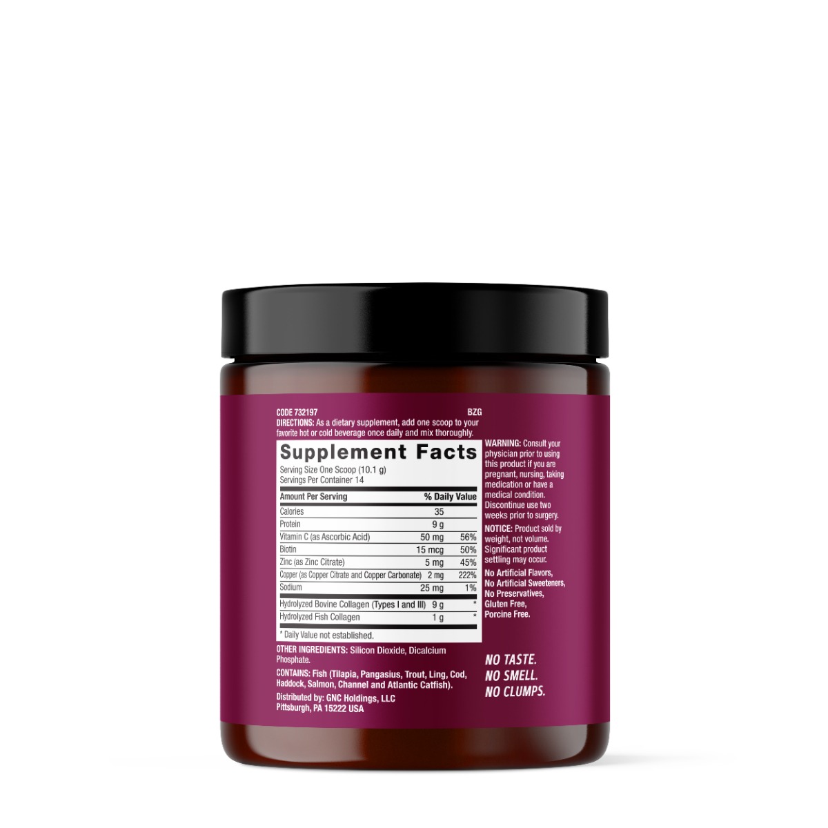 Calitate Premium, Rezultate Premium – GNC redefineste standardele cu Colagen Powder! Colagenul pudra este un supliment, creat pentru a rejuvena, hidrata si netezi pielea. Formula avansata contine 10.000 mg colagen hidrolizat bovin si marin, care este dovedit clinic pentru rezultate reale de imbunatatire a frumusetii, de inalta calitate, combinat cu 5 ingrediente esentiale: Vitamina C, biotina, zinc, cupru si sodiu. Acestea actioneaza sinergic pentru a oferi fermitate, hidratare profunda si protectie antioxidanta pielii, fara compromisuri in ceea ce priveste calitatea. Este destinat atat femeilor, cat si barbatilor, indifderent de varsta, care doresc sa-si ingrijeasca pielea printr-o solutie eficienta, usor de integrat in rutina zilnica. Revitalizeaza pielea: Datorita continutului ridicat de colagen marin si bovin hidrolizat, produsul ajuta la reducerea semnelor de imbatranire, oferind un aspect mai tanar si mai ferm. Sprijina productia naturala de colagen: Vitamina C stimuleaza sinteza colagenului natural din organism, oferind un suport suplimentar pentru o piele mai sanatoasa si mai stralucitoare. Protejeaza impotriva imbatranirii premature: Combinatia de vitamina C, zinc si cupru ofera protectie antioxidanta, reducand efectele daunatoare ale radicalilor liberi si prevenind imbatranirea prematura. Intareste parul si unghiile: Biotina din compozitie ajuta la imbunatatirea sanatatii parului si unghiilor, facandu-le mai puternice si mai rezistente. Sustine sanatatea articulatiilor: Cele doua surse de colagen ofera beneficii multiple pentru sanatatea articulatiilor, imbunatatind mobilitatea si sanatatea sistemului osteo-articular. Ingrediente naturale si curate: Fara coloranti artificiali, arome artificiale si conservanti, produsul este creat pentru a oferi un consum sigur si benefic pentru sanatatea ta, fara compromisuri. Potrivit pentru diverse diete: Fara gluten, produsul este potrivit pentru o gama larga de diete si restrictii alimentare. Aroma nedetectabila si utilizare super versatile: Fara gust, fara miros, fara aroma, poate fi amestecat in bautura dumneavoastra sau presarat in masa dumneavoastra. *Produsul este un supliment alimentar si nu trebuie sa inlocuiasca o dieta variata si echilibrata si un stil de viata sanatos.