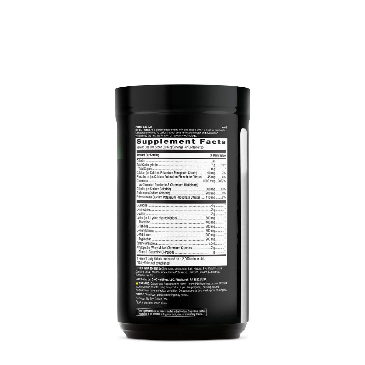 GNC Beyond Raw® Precision Amino, Aminoacizi cu Aroma de Mere Mod de administrare: ca supliment alimentar, amestecati 1 cupa dozatoare in 480 ml apa rece. Consumati doar daca va doriti regenerare inteligenta a musculaturii si hidratare. Portie de servire: 1 cupa (20.6 g) Portii per recipient: 25 Compozitie / portie Cantitate %VNR Calorii 30 Total grasimi 0 g 0%** Acizi grasi 0 g 0%** Total carbohidrati 7 g 2.69%** Total zaharuri 0 g 0%** Calciu (citrat fosfat potasic de calciu) 90 mg 11.25%** Fosfor (citrat fosfat potasic de calciu) 45 mg 6.43%** Crom (crom picolinat si histidinat de crom) 1000 mcg 2500%** Clorura (clorura de sodiu) 300 mg 37.5%** Sodiu (clorura de sodiu) 200 mg * Potasiu (citrat fosfat potasic de calciu) 110 mg 5.5%** L-Leucina 4 g * L-izoleucina 2 g * L-valina 2 g * Lizina (clorhidrat de l-lizina) 600 mg * L-treonina 400 mg * L-histidina 300 mg * L-fenilalanina 300 mg * L-metionina 200 mg * L-triptofan 200 mg * Betaina anhidra 2.5 g * Amilopectina (ceara din porumb) complex de crom 2 g * Dl-peptide l-alanil-l-glutamina 1 g * *Valoarea nutritionala de referinta nu a fost stabilita. **Valoarea nutritionala de referinta, conform Reg. UE nr. 1169/2011. Ingrediente: carbohidrati, l-leucina, betaina anhidra, l-izoleucina, l-valina, amilopectina, lizina, l-treonina, di-peptide l-alanil-l-glutamina, clorura, clorura, l-histidina, l-fenilalanina, sodiu, l-metionina, l-triptofan, potasiu, calciu, fosfor, crom, acid citric, acid malic, sare, arome naturale si artificiale. Contine mai putin de 2% din: acesulfam de potasiu, silicat de calciu, sucraloza, lecitina din floarea soarelui. Atentionari: A se consulta un medic specialist inainte de a consuma acest produs in caz de sarcina, alaptare, daca urmati un tratament medicamentos sau suferiti de o afectiune medicala. Intrerupeti administrarea cu doua saptamani inainte de o interventie chirurgicala. Produsul este un supliment alimentar si nu trebuie sa inlocuiasca o dieta variata si echilibrata si un stil de viata sanatos. A nu se lasa la indemana si la vederea copiilor mici. A nu se depasi doza recomandata pentru consumul zilnic. Se poate produce o decantare semnificativa a produsului. Nu contine: zahar, soia, gluten. Conditii de pastrare: In ambalajul original, la loc uscat, la temperatura camerei. Producator: GNC Holdings, LLC, Pittsburg, PA 15222, SUA. Fabricat in: S.U.A.