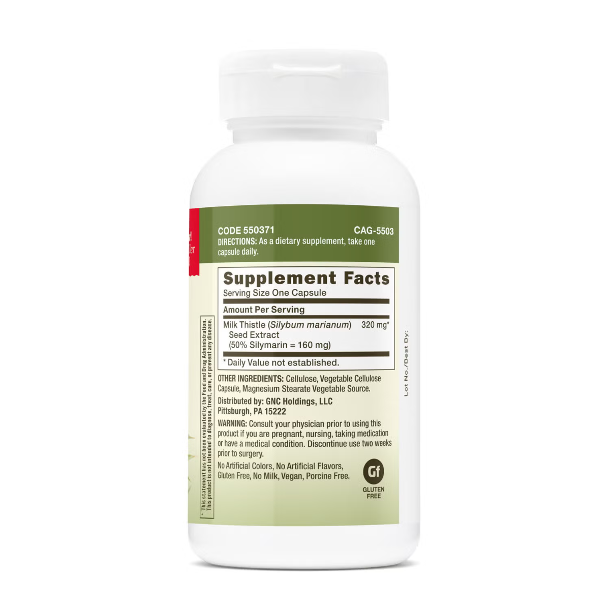 GNC Herbal Plus® Milk Thistle 320 mg, Extract de silimarina 320 mg Mod de administrare: ca supliment alimentar, administrati 1 capsula pe zi. Prezentare: 100 capsule | Portie zilnica de servire: 1 capsula | Portii per flacon: 100 Compozitie / portie Cantitate %VNR Extract din seminte de armurariu (Silybum marianum) (std. La 50% silimarina = 160 mg) 320 mg * *Valoarea nutritionala de referinta nu este stabilita. **Valoarea nutritionala de referinta, conform Reg. UE nr. 1169/2011 Ingrediente: Extract din seminte de armurariu, celuloza, capsula din celuloza vegetala, stearat de magneziu din sursa vegetala. Atentionari: Produsul este un supliment alimentar si nu trebuie sa inlocuiasca o dieta variata si echilibrata si un stil de viata sanatos. A nu se lasa la indemana si la vederea copiilor. A nu se depasi doza recomandata pentru consumul zilnic. A se consulta un medic specialist inainte de a consuma acest produs in caz de sarcina, alaptare, daca urmati un tratament medicamentos sau suferiti de o afectiune medicala. Intrerupeti administrarea cu doua saptamani inainte de o interventie chirurgicala. Nu contine: coloranti artificiali, arome artificiale, gluten, lapte, ingrediente de origine porcina. Produs vegan. Conditii de pastrare: In ambalajul original, la loc uscat, la temperatura camerei. Producator: GNC HOLDING,LLC PITTSBURGH,PA 15222 USA. Fabricat in: SUA