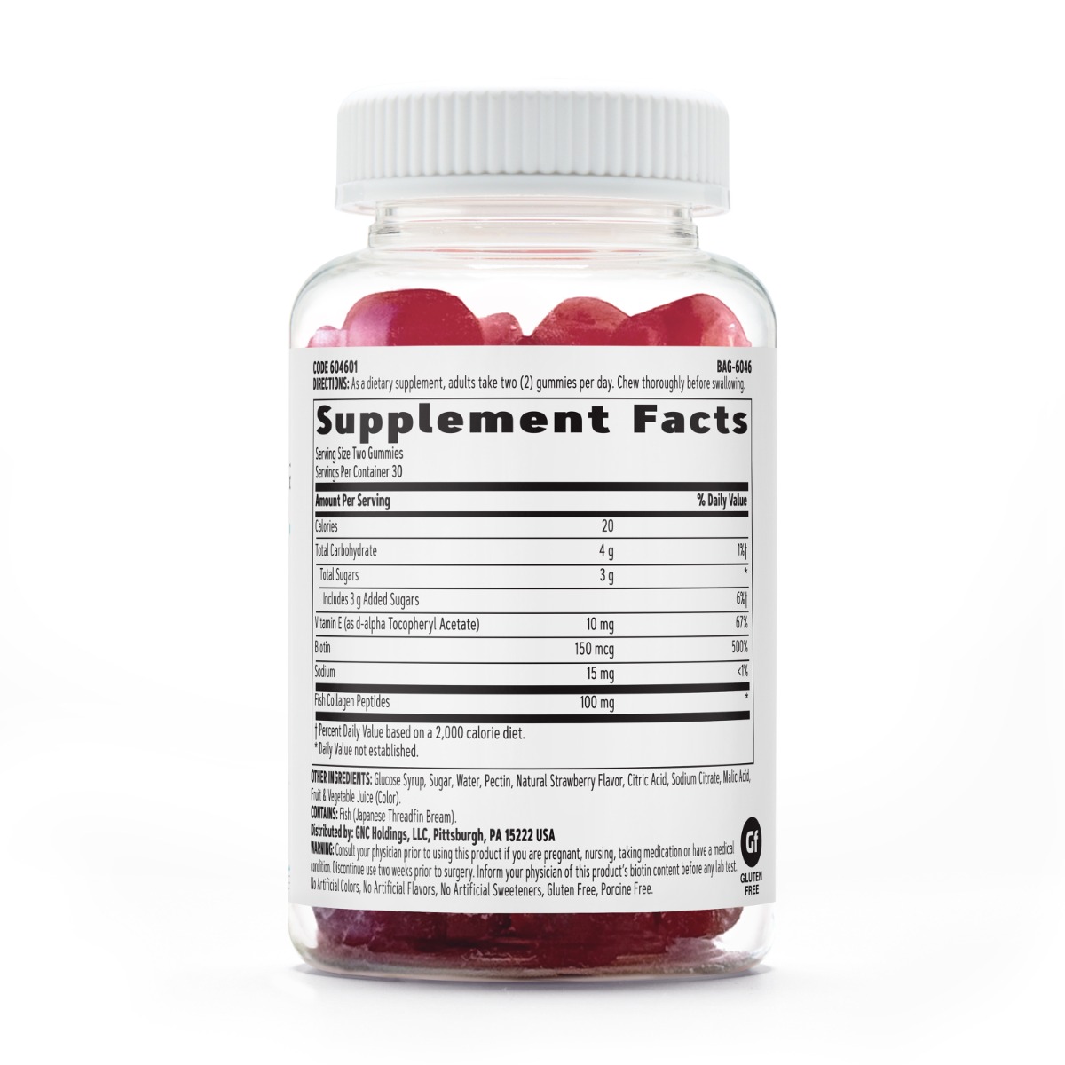 GNC Women’s Hair, Skin & Nails Strawberry , jeleuri cu biotina si vitamine pentru frumusetea parului, pielii si unghiilor Mod de administrare: ca supliment alimentar, este recomandat ca adultii sa administreze doua jeleuri pe zi. Prezentare: 60 jeleuri Portie de servire: 2 jeleuri Portii per flacon: 30 Compozitie / portie de servire Cantitate %VNR Calorii 20 Total grasimi 0 g 0%** Acizi grasi 0 g 0%** Total carbohidrati 4 g 1.54%** Total zaharuri 3 g 3.33%** Zaharuri adaugate 3 g * Vitamina E (acetat d-alfa-tocoferil) 10 mg 83.33%** Biotina 150 mcg 300%** Sodiu 15 mg * Peptide de colagen din peste 100 mg * Ingrediente: Peptide de colagen din peste, sodiu, vitamina E, biotina, sirop din glucoza, zahar, apa, pectina, aroma naturala de capsuni, acid citric, citrat de sodiu, acid malic, suc de fructe si legume (colorant). Contine: peste (dorada japoneza). Mod de administrare: ca supliment alimentar, este recomandat ca adultii sa administreze doua jeleuri pe zi. Atentionari: Produsul este un supliment alimentar si nu trebuie sa inlocuiasca o dieta variata si echilibrata si un stil de viata sanatos. A nu se depasi doza recomandata zilnic. A nu se lasa la indemana si la vederea copiilor. Informati medicul de continutul de biotina al produsului inainte de orice test de laborator. Consultati un medic specialist inainte de a utiliza acest produs daca sunteti insarcinata, alaptati, administrati un tratament medicamentos sau aveti o afectiune medicala. Intrerupeti administrarea cu doua saptamani inaintea oricarei interventii chirurgicale. Nu contine: coloranti artificiali, arome artificiale, indulcitori artificiali, gluten, ingrediente de origine porcina. Conditii de pastrare: In ambalajul original, la loc uscat si racoros. A se consuma, de preferinta, inainte de sfarsitul: Data de expirare este exprimata in formatul MM/DD/YYYY (luna/zi/an). Va rugam sa verificati cu atentie interpretarea corecta. Fabricat in: SUA