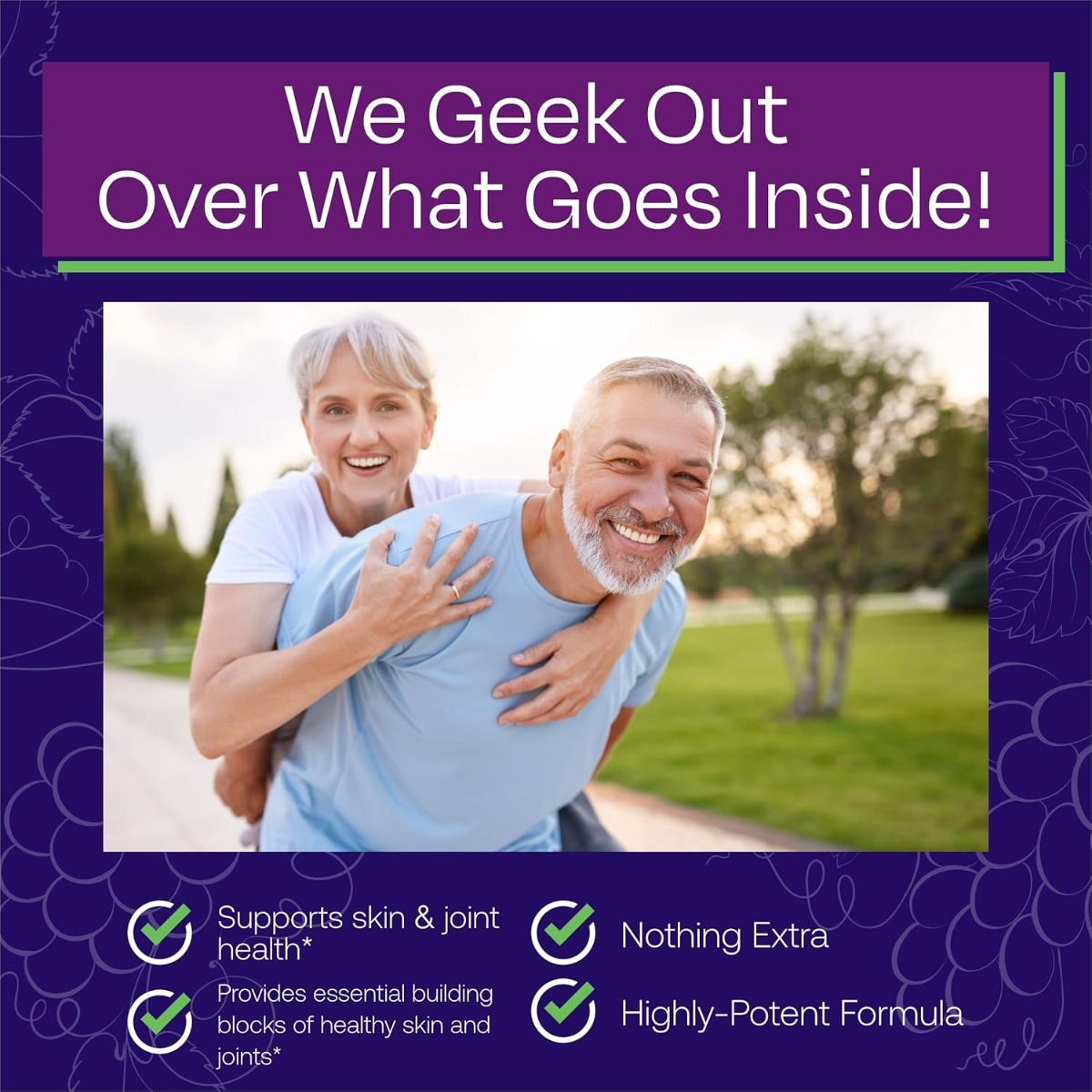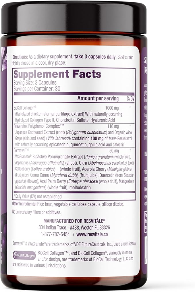 ResVitale™ Ultra Collagen Enhance™, Colagen avansat pentru fermitate, hidratare si frumusetea pieliiMod de administrare: ca si supliment alimentar administrati 3 capsule pe zi. Prezentare: 90 capsule vegetale| Portie de servire: 3 capsule | Portii per recipient: 30 Compozitie Cantitate % VNR Colagen BioCell® (Extract din cartilaj hidrolizat din stern de pui) si apar in mod natural colagen hidrolizat tip II, sulfat de condroitina, acid hialuronic 1000 mg * Amestec brevetat de Polifenoli si Resveratrol™ Extract din troscot japonez (radacina)(Polygonum cuspidatum) si struguri de vin organici (coaja si seminte)(Vitis labrusca), continand 100 mg de trans-resveratrol, cu epicatechin, quercitin, acid galic și catechin care apar natural 110 mg * Dermaval™ VitaGranate® BioActive – extract de rodie (Punica granatum) (fruct intreg), sparanghel (Asparagus officinalis) (incoltit), bame (Abelmoschus esculentus) (pastai), fruct de cafea (Coffea arabica)(fruct intreg), acerola (Malpighi glabra)(suc de fructe), camu camu (Myrciaria dubia) (suc de fructe), quercitina (Sophora japonica)(floare), fructe din palmier acai (Euterpe oleracea) (fruct intreg), mangosteen (Garcinia mangostana), maltodextrina 50 mg * *Valoarea nutritionala de referinta nu este stabilita. **Valoarea nutritionala de referinta, conform Reg. UE nr. 1169/2011. Ingrediente: Colagen BioCell®, amestec brevetat de Polifenoli si Resveratrol®, Dermaval™, tarate de orez, capsula din celuloza vegetala, dioxid de siliciu. Atentionari: Consultati medicul inainte de a utiliza acest produs daca sunteti insarcinata, alaptati, daca luati medicamente sau aveti o afectiune medicala. Produsul este un supliment alimentar si nu trebuie sa inlocuiasca o dieta variata si echilibrata si un stil de viata sanatos. A nu se lasa la vederea si indemana copiilor mici. A nu se depasi doza recomandata pentru consumul zilnic. Nu utilizati daca sigiliul este rupt sau lipseste. Nu contine: gluten. Conditii de pastrare: in flaconul original, la temperatura camerei, la loc uscat. Producator: Resvitale®, 304 Indian Trace -#438, Weston FL 33326 Fabricat in: SUA