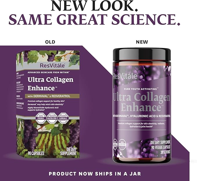 ResVitale™ Ultra Collagen Enhance™, Colagen avansat pentru fermitate, hidratare si frumusetea pielii Bucurati-va de un efect natural de umplere a ridurilor cu ajutorul a trei ingrediente revolutionare. BioCell Collagen® ajuta la umplerea celulelor de colagen vitale pentru a netezi aspectul liniilor si ridurilor, in timp ce patentul testat clinic Dermaval™ ajuta la mentinerea elasticitatii pentru un contur al fetei neted si pentru un efect de lifting. Trans-Resveratrol promoveaza activitatea celulara prin efectul de regenerare si intinerire. Beneficii: Formula Ultra Collagen-Enhance™ mareste luminozitatea, textura si fermitatea pielii; Patentatul Dermaval™ a fost testat clinic, ajuta la mentinerea elasticitatii pielii si are un efect de diminuare a ridurilor; Arta ﹘ O alianta a naturii si a stiintei ofera protectie si regenerare profunda pentru piele. Resveratrolul provenit din strugurii rosii frantuzesti, organic si potent este combinat cu patentele in frumusete Dermaval™ si BioCell Collagen® pentru a forma o bariera nutritionala superioara a pielii impotriva imbatranirii celulare; BioCell Collagen® utilizeaza acidul hialuronic si condroitina pentru a umple si reduce adancimea liniilor si a ridurilor din interior, in timp ce Dermaval™ ajuta la pastrarea elasticitatii si stralucirii pielii; Dovada ﹘ Oamenii de stiinta pentru ingrijirea pielii au descoperit o modalitate de a mentine elasticitatea pielii. S-a demonstrat ca Dermaval™ are abilitatea de a mentine tonusul si textura pielii tinere; Constructor de proteine de frumusete ultraintensiv; Reduce liniile fine si ridurile; Confera stralucirea si imbunatateste textura pielii. *Produsul este un supliment alimentar si nu trebuie sa inlocuiasca o dieta variata si echilibrata si un stil de viata sanatos.