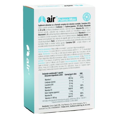 Air7 este un supliment alimentar conceput pentru a susține funcția pulmonară, a proteja căile respiratorii și a întări sistemul imunitar.
