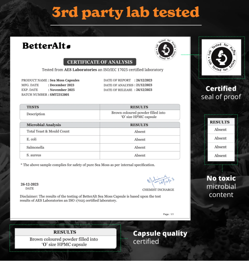 BETTER ALT® Shilajit Sea Moss, Formula de Shilajit cu Alge Marine, Ashwagandha si Tongkat AliPrezentare: 120 capsule | Portie de servire: 2 capsula | Portii per flacon: 60 Mod de administrare: ca supliment alimentar, administrati 2 capsula pe zi, dupa micul dejun. Compozitie / portie de servire Cantitate %VNR Total grasimi 0 g 0%** Acizi grasi 0 g 0%** Extract de Shilajit (20:1) Echivalent cu 8800 mg pudra de Shilajit 440 mg * Extract din mușchi de mare (20:1) Echivalent cu 2000 mg pulbere de muschi de mare 100 mg * Extract de Gingko Biloba Echivalent cu 1000 mg pudra de Ginkgo Biloba 100 mg * Extract de Tongkat Ali (300:1) Echivalent cu 1800 mg pudra de Tongkat Ali 60 mg * Extract de Ashwagandha (30:1) Echivalent cu 1800 mg pudra de Ashwagandha 60 mg * Extract din radacina de Maca (10:1) Echivalent cu 500 mg pudra din radacina de Maca 50 mg * Extract de Safed Musli (20:1) Echivalent cu 1000 mg pudra de Safed Musli 50 mg * Extract de Panax Ginseng (10:1) Echivalent cu 500 mg pudra de Panax Ginseng 50 mg * Zinc (sub forma de Zinc gluconat) 5 mg 50%** Extract de piper negru (95%) 5 mg * *Valoarea nutritionala de referinta nu a fost stabilita.**Valoarea nutritionala de referinta, conform Reg. UE nr. 1169/2011. Ingrediente: Extract de Shilajit, extract din mușchi de mare, extract de Gingko biloba, extract de Tongkat Ali, extract de Ashwagandha, extract de radacina de Maca, extract de Safed Musli, extract de Panax Ginseng, zinc, extract de piper negru, hidroxipropil metilceluloza capsule goale. Atentionari: Consultati medicul inainte de a utiliza acest produs daca sunteti insarcinata, alaptati, administrati alte medicamente sau aveti o afectiune medicala. Produsul este un supliment alimentar si nu trebuie sa inlocuiasca o dieta variata si echilibrata si un stil de viata sanatos. A nu se lasa la indemana si la vederea copiilor. A nu se depasi doza recomandata pentru consumul zilnic. Nu folositi daca sigiliul este rupt sau lipseste. Nu contine: Organisme modificate genetic, gluten, conservanti. Conditii de pastrare: in flaconul original, la loc uscat si racoros, ferit de lumina directa a soarelui.Producator: SWARANIMAKASH LIFE SCIENCES PVT. LTD., B 08, Sara Industrial Estate, Rampur Selaqui, Dehradun, Uttarakhand-248197Fabricat in: India