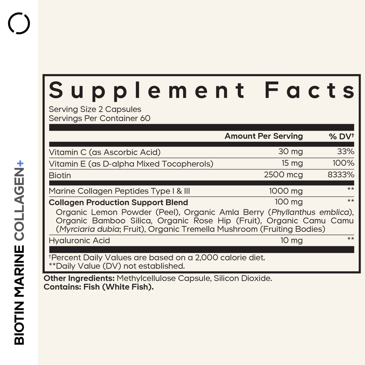 CodeAge Biotin Marine Collagen+formula completa cu colagen marin si acid hyaluronic CodeAge Biotin Marine Collagen+ reuneste intr-o singura formula complexa colagen marin de tip I & II, biotina, acid hialuronic si un amestec atent ales de superalimente si extracte botanice organice. O combinatie premium ce sustine frumusetea si vitalitatea zilnica. ✨Beneficii cheie: Piele hidratata si ferma – colagenul marin si acidul hialuronic contribuie la mentinerea elasticitatii si luminozitatii pielii. Par si unghii puternice – biotina in doza optima (10.000 mcg) sprijina cresterea si rezistenta firului de par si sanatatea unghiilor. Protectie antioxidanta – vitamina C, vitamina E si extractele naturale (camu camu, macese, amla) lupta impotriva stresului oxidativ. Sprijin pentru productia naturala de colagen – bambusul (bogat in siliciu) si ciuperca Tremella completeaza formula pentru un efect complex. ✨Formula completa per portie (4 capsule): Colagen marin tip I & II – 2000 mg Biotina – 10.000 mcg Acid hialuronic – 50 mg Vitamina C – 60 mg (67% VNR) Vitamina E – 33.5 mg (223% VNR) Amestec organic de superalimente (388 mg): pulbere de lamaie, fructe de amla, bambus (siliciu), extract de macese, camu camu si ciuperca Tremella ✨ De ce sa alegi CodeAge Biotin Marine Collagen+?Aceasta formula unica combina nutrienti esentiali pentru frumusete cu ingrediente de calitate superioara, pentru a sustine sanatatea pielii, a parului si a unghiilor din interior. Fara compromisuri – doar sustinere reala pentru un aspect tanar si stralucitor. *Produsul trebuie consumat ca parte a unei diete echilibrate.
