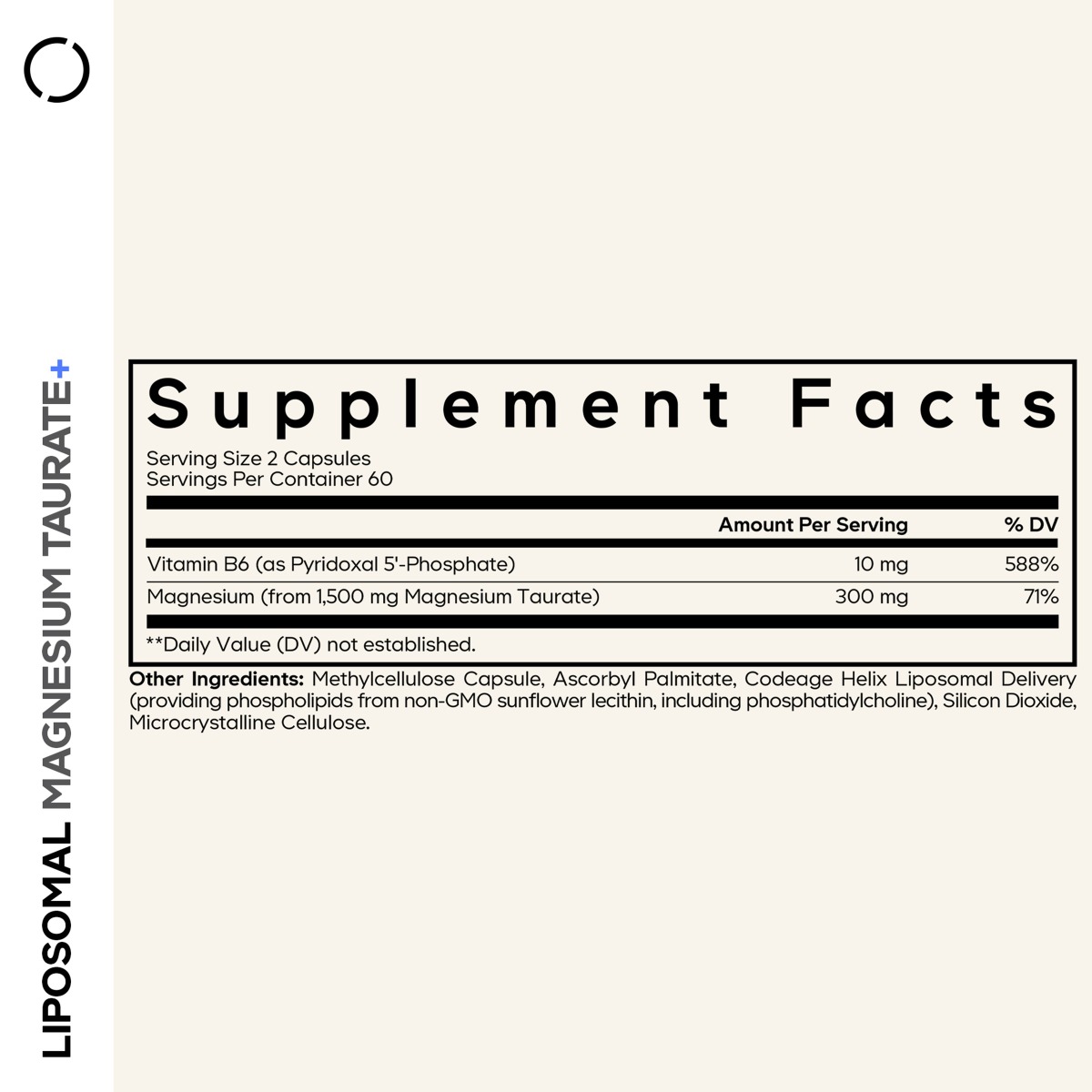 CodeAge Liposomal Magnesium Taurate+, Magneziu Taurat cu Tehnologie Liposomala Pentru Sanatatea Inimii si Sistemului Nervos Mod de administrare: pentru adulti, administrati 2 capsule zilnic impreuna cu 236 ml de apa sau orice bautura preferata. Poate fi administrata impreuna cu sau fara mancare. Prezentare: 120 capsule vegetale| Portie de servire: 2 capsule | Portii per flacon: 60 Compozitie / portie Cantitate %VNR Vitamina B-6 (piridoxal 5-fosfat) 10 mg 714.28%** Magneziu (din 1500 mg taurat de magneziu) 300 mg 80%** *Valoarea nutritionala de referinta nu este stabilita. **Valoarea nutritionala de referinta, conform Reg. UE nr. 1169/2011. Ingrediente: Magneziu, vitamina B-6, capsula metilceluloza, palmitat de ascorbil, Codeage Helix matrice de livrare lipozomala (furnizand fosfolipide din lecitina de floarea-soarelui fara organisme modificate genetic, incluzand fosfatidilcolina). Atentionari: A nu se depasi doza zilnica recomandata. Daca sunteti insarcinata, alaptati, aveti o afectiune medicala sau administrati un tratament medicamentos, consultati un medic specialist inainte de a utiliza acest produs sau orice alt supliment alimentar. Intrerupeti administrarea cu 2 saptamani inaintea unei interventii chirurgicale. Va rugam sa fiti prudent daca aveti alergie sau sensibilitate la oricare dintre ingredientele mentionate. Produsul este un supliment alimentar si nu trebuie sa inlocuiasca o dieta variata si echilibrata si un stil de viata sanatos. A nu se lasa la indemana si vederea copiilor. Produl nu este destinat persoanelor cu varsta sub 18 ani. Nu contine: organisme modificate genetic, soia, lactate, gluten. Produs Vegan. Conditii de pastrare: in ambalajul original, la loc uscat si racoros. Producator: CODEAGE LLC, Boca Raton, FL 33431, SUA. Fabricat in: SUA
