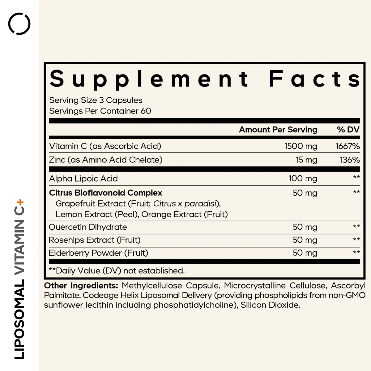 CodeAge Liposomal Vitamin C, Vitamina C Liposomala – Formula Avansata pentru Absorbtie Superioara Mod de administrare: Se recomanda ca adultii sa administreze 3 capsule zilnic impreuna cu 236 ml de apa sau orice bautura preferata. Poate fi administrat impreuna cu sau fara mancare. Prezentare: 180 capsule vegetale | Portie de servire: 3 capsule vegetale | Portii per flacon: 60 Compozitie / portie Cantitate %VNR Vitamina C (acid ascorbic) 1500 mg 1875%** Zinc (chelat de aminoacizi) 15 mg 150%** Acid alfa lipoic 100 mg * Complex bioflavonoid de citrice Extract de grepfruit (fruct; Citrus x paradisi), extract de lamaie (coaja), extract de portocala (fruct) 50 mg * Quercetina dihidrat 50 mg * Extract de macese (fruct) 50 mg * Pudra de soc (fruct) 50 mg * *Valoarea nutritionala de referinta nu a fost stabilita.**Valoarea nutritionala de referinta, conform Reg. UE nr. 1169/2011. Ingrediente: vitamina C, acid alfa lipoic, complex de bioflavonoide din citrice, quercetina dihidrat, extract de macese, extract de soc, zinc, capsula din metilceluloza, celuloza microcristalina, palmitat de ascorbil, Codeage Helix Matrice de livrare lipozomala (furnizand fosfolipide din lecitina de floarea-soarelui fara organisme modificate genetic incluzand fosfatidilcolina), dioxid de siliciu. Atentionari: Produsul este un supliment alimentar si nu trebuie sa inlocuiasca o dieta variata si echilibrata si un stil de viata sanatos. A nu se lasa la indemana si vederea copiilor. A nu se depasi doza zilnica recomandata. Daca sunteti insarcinata, alaptati, aveti varsta sub 18 ani, aveti o afectiune medicala sau administrati un tratament medicamentos, consultati un medic specialist inainte de a utiliza acest produs sau orice alt supliment alimentar. Intrerupeti administrarea cu 2 saptamani inaintea unei interventii chirurgicale. Va rugam sa fiti prudent daca aveti alergie sau sensibilitate la oricare dintre ingredientele mentionate. Nu contine: oganisme modificate genetic, soia, lactate, gluten. Produs vegan. Conditii de pastrare: in ambalajul original, la loc uscat si racoros. Producator: Codage LLC, Boca Raton, FL 33431, SUA Fabricat in: SUA