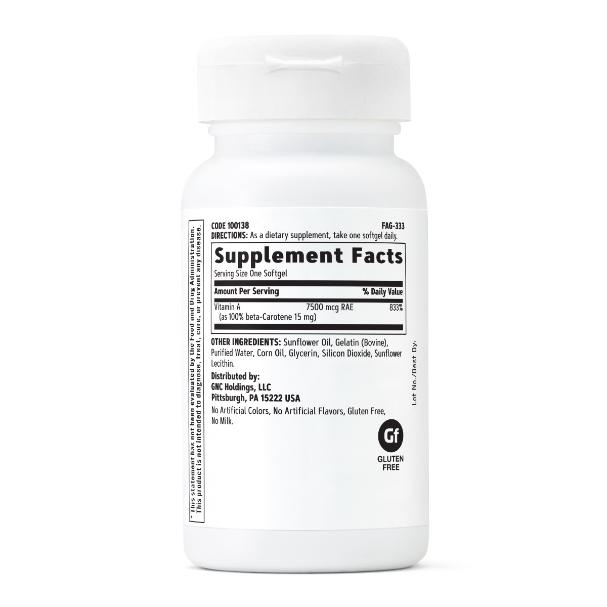 GNC Beta-Caroten 15 mg Mod de administrare: administrati 1 capsula gelatinoasa pe zi. Prezentare: 180 capsule gelatinoase | Portia de servire: 1 capsula gelatinoasa | Portii per flacon: 180 Compozitie / portie Cantitate %VNR* Vitamina A (100% beta-caroten 15 mg) 7500 mcg RAE 937.5%** *Valoarea nutritionala de referinta se bazeaza pe o dieta de 2000 de calorii. Ingrediente: Vitamina A, ulei din floarea-soarelui, gelatina (bovina), apa purificata, ulei din porumb, glicerina, dioxid de siliciu, lecitina de floarea soarelui. Atentionari: Produsul este un supliment alimentar si nu trebuie sa inlocuiasca o dieta variata si echilibrata si un stil de viata sanatos. A nu se lasa le indemana si la vederea copiilor. A nu se depasi doza recomandata pentru consumul zilnic. Consultati un medic specialist inainte de a utiliza acest produs daca sunteti insarcinata, alaptati, administrati un tratament medicamentos sau aveti o afectiune medicala. Intrerupeti administrarea cu doua saptamani inaintea oricarei interventii chirurgicale. Nu contine: coloranti artificiali, arome artificiale, gluten, lapte. Conditii de pastrare: in ambalajul original, la loc uscat, la temperatura camerei. Producator: GNC HOLDINGS, LLC, Pittsburgh, PA 15222, USA. Fabricat in: SUA