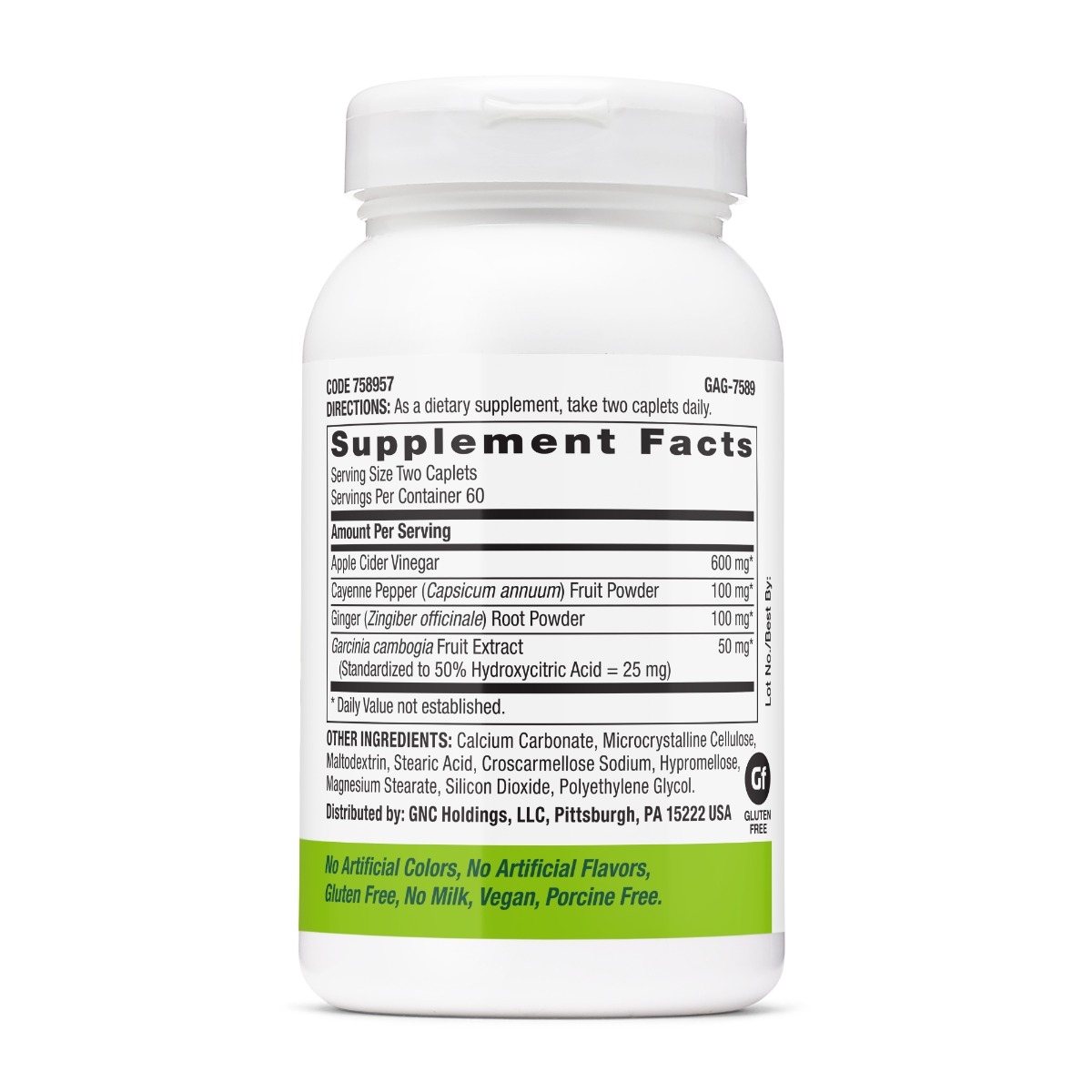 GNC Super Foods Otet din Cidru de Mere Mod de administrare: administrati 2 tablete zilnic. Prezentare: 120 tablete vegane | Portia de servire: 2 tablete vegane | Portii per flacon: 60 Compozitie / portie Cantitate %VNR Otet din cidru de mere 600 mg * Pudra din fruct de piper cayenne (Capsicum annuum) 100 mg * Pudra din radacina de ghimbir (Zingiber officinale) 100 mg * Extract din fruct de Garcinia Cambogia (std. la 50% acid hidroxicitric = 25 mg) 50 mg * *Valoarea nutritionala de referinta nu este stabilita.**Valoarea nutritionala de referinta, conform Reg. UE nr. 1169/2011. Ingrediente: Otet din cidru de mere, pudra din fruct de piper cayenne (Capsicum annuum), pudra din radacina de ghimbir (Zingiber officinale), extract din fruct de Garcinia Cambogia (std. la 50% acid hidroxicitric = 25 mg), carbonat de calciu, celuloza microcristalina, maltodextrina, acid stearic, croscarmeloza sodica, hipromeloza, stearat de magneziu, dioxid de siliciu, polietilen glicol. Atentionari: Produsul este un supliment alimentar si nu trebuie sa inlocuiasca o dieta variata si echilibrata si un stil de viata sanatos. A nu se lasa la indemana si la vederea copiilor. A nu se depasi doza recomandata pentru consumul zilnic. Consultati un medic specialist inainte de a utiliza acest produs in cazul in care sunteti insarcinata, alaptati, administrati alte medicamente sau aveti o afectiune medicala. Intrerupeti administrarea cu doua saptamani inaintea oricarei interventii chirurgicale. Nu contine: coloranti artificiali, arome artificiale, gluten, lapte, ingrediente de origine porcina. Produs vegan. Conditii de pastrare: in flaconul original, la loc uscat si racoros.Producator: GNC HOLDINGS, LLC, Pittsburg, PA 15222, SUA.Fabricat in: SUA