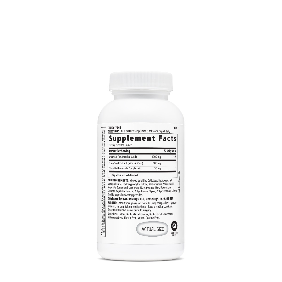 GNC Vitamin C + Grape Seed, Vitamina C 1000 Mg cu Bioflavonoide si Extract din Seminte de Struguri cu Eliberare Prelungita Contribuie la functionarea normala a sistemului imunitar si la reducerea stresului oxidativ. Prezentare: 30 tablete vegetale | Portia de servire: 1 tableta | Portii per flacon: 30 Mod de administrare: ca supliment alimentar, administrati 1 tableta pe zi. Compozitie / portie de servire Cantitate %VNR* Total grasimi 0 g 0%** Acizi grasi 0 g 0%** Vitamina C (Acid Ascorbic) 1000 mg 1250%** Extract din seminte de struguri (Vitis vinifera) 100 mg * Complex de bioflavonoide citrice 4:1 50 mg * **Valoarea nutritionala de referinta, conform Reg. UE nr. 1169/2011. *Valoarea nutritionala de referinta nu a fost stabilita. Ingrediente: vitamina C, extract din seminte de struguri, complex de bioflavonoide citrice, celuloza microcristalina, hidroxipropil metilceluloza, hidroxipropilceluloza, maltodextrina, acid stearic din sursa vegetala si mai putin de 2%: ceara de carnauba, stearat de magneziu din sursa vegetala, polietilen glicol, polisorbat 80, dioxid de siliciu, acetogliceride vegetale. Atentionari: Consultati medicul specialist inainte de a folosi acest produs daca sunteti insarcinata, alaptati, administrati alte medicamente sau aveti o afectiune medicala. Intrerupeti administrarea cu 2 saptamani inaintea oricarei interventii chirurgicale. Produsul este un supliment alimentar si nu trebuie sa inlocuiasca o dieta variata si echilibrata si un stil de viata sanatos. A nu se lasa la indemana si vederea copiilor. A nu se depasi doza recomandata pentru consumul zilnic. Nu contine: coloranti artificiali, arome artificiale, indulcitori artificiali, conservanti, gluten, ingrediente de origine porcina. Produs vegan. Conditii de pastrare: in flaconul original, la temperatura camerei, la loc uscat si ferit de lumina directa a soarelui. Producator: General Nutrition Corp. Pittsburgh, PA 15222, SUA. Fabricat in: SUA