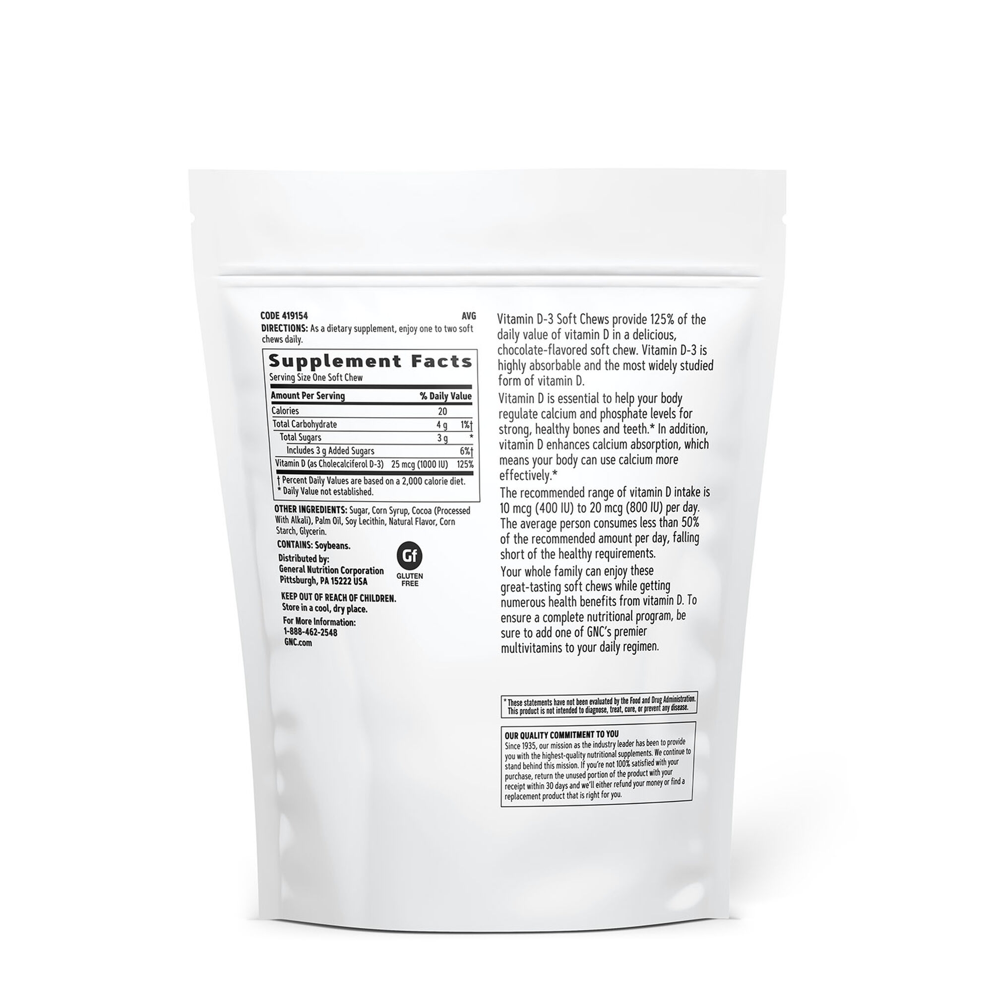 GNC Vitamina D-3 1000 UI Caramele cu Aroma de Ciocolata Mod de administrare: Ca supliment alimentar, consumati intre una si doua caramele pe zi. Portie de servire: 1 caramea Portii per pachet: 60 Compozitie / portie de servire Cantitate %VNR Calorii 20 Total carbohidrati 4 g 1%† Zaharuri 3 g * Zahar adaugat 3 g 6%† Vitamina D (colecalciferol D-3) 25 mcg (1000 UI) 125% †Valoarea nutritionala de referinta se bazeaza pe o dieta de 2000 de calorii. *Valoarea nutritionala de referinta nu este stabilita. Alte ingrediente: zahar, sirop de porumb, cacao (procesata cu alkali), ulei de palmier, lecitina din soia, arome naturale, amidon din porumb, glicerina. Contine: boabe de soia. Atentionari: Produsul este un supliment alimentar si nu trebuie sa inlocuiasca o dieta variata si echilibrata si un stil de viata sanatos. A nu se lasa la indemana copiilor mici. A nu se depasi doza recomandata pentru consumul zilnic. Nu contine: gluten. Conditii de pastrare: in ambalajul original, la loc uscat, la temperatura camerei. Termen de valabilitate: vezi data mentionata pe ambalaj. Producator: General Nutrition Corporation, Pittsburgh, PA 15222, USA. Fabricat in: USA