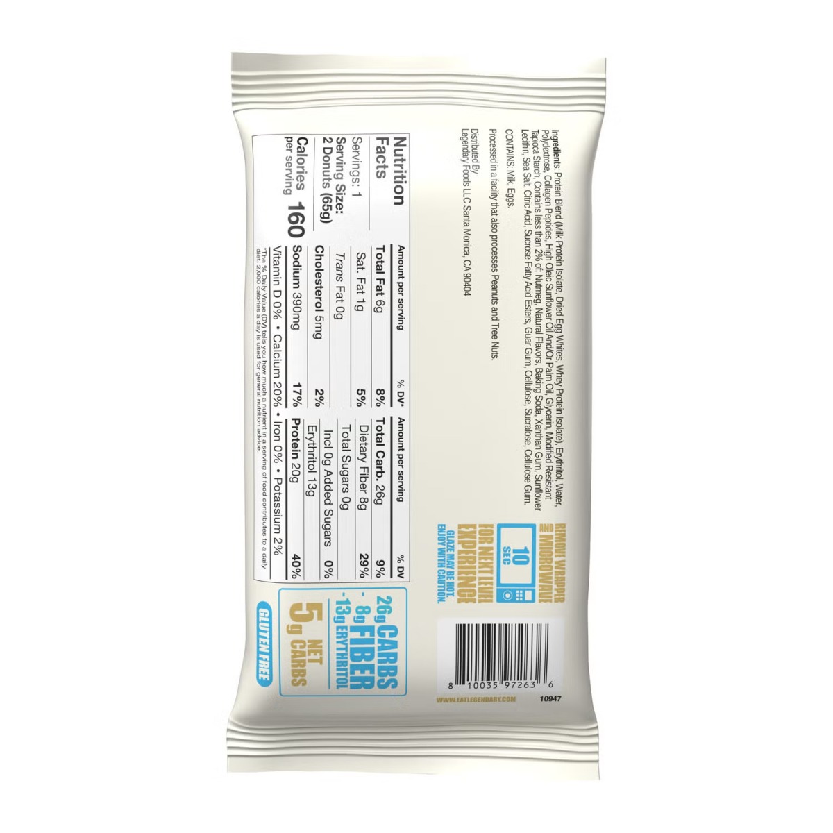 Legendary Foods™ protein donut with vanilla glazed, Gogoasa proteica cu glazura de vanilie Gust delicios, proteine de calitate Savureaza o gustare proteica care combina placerea unei gogosi cu beneficiile nutritionale ale proteinelor. Beneficii: · 20 g proteine dintr-un amestec premium de izolat de proteina din lapte, albusuri de ou deshidratate si izolat de proteina din zer; · 0 g zahar adaugat si doar 5 g carbohidrati neti, fiind ideal pentru diete keto sau low-carb; · 160 calorii per portie (2 donuts), cu 50% din calorii provenind din proteine; · Fara gluten, GLP-1 friendly si potrivit pentru stiluri de viata vegane; · Gust autentic de gogoasa cu glazura de vanilie, fara compromisuri; · Sursa excelenta de proteine pentru recuperare post-antrenament sau gustare intre mese; · Potrivit in dieta keto; · Ambalaj convenabil de 65 g, perfect pentru a fi savurat acasa sau in miscare. *Produsul trebuie consumat ca parte a unei diete echilibrate.