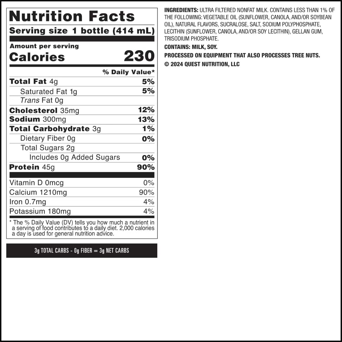 Quest® Protein Milkshake RTD, milkshake proteic cu aroma de vanilie Cantitate neta: 414 ml | Portie de servire: 1 sticla (414 ml) Mod de administrare: Agitati bine inainte de utilizare. Nu congelati. A se pastra la frigider dupa deschidere. Compozitie / portie de servire Cantitate %VNR Calorii 230 Total grasimi 4 g 5.71%** Grasimi saturate 1.5 g 7.5%** Grasimi trans 0 g * Colesterol 35 mg * Sodiu 300 mg * Total carbohidrati 3 g 1.15%** Fibre dietetice 0 g 0%** Total zaharuri 2 g 2.22%** Zaharuri adaugate 0 g * Proteina 45 g 90%** Vitamina D 0 mcg 0%** Calciu 1210 mg 151.25%** Fier 0.7 mg 5%** Potasiu 180 mg 9%** * Valoarea nutritionala de referinta nu este stabilita. **Valoarea nutritionala de referinta, conform Reg UE, nr 1169/2011. Ingrediente: Proteina, calciu, potasiu, fier, lapte praf degresat ultra filtrat. Contine mai putin de 1%: uleiuri vegetale (floarea-soarelui, rapita, ulei din boabe de soia), arome naturale, sucraloza, sare, polifosfat sodic, lecitina (floarea-soarelui, rapita, si/sau lecitina din soia), guma de gellan, fosfat trisodic. Contine: lapte, soia. Produsul a fost procesat intr-o unitate in care se produc alimente care conțin alune de padure. Atentionari: Produsul trebuie consumat ca parte a unei diete echilibrate. Supradoza accidentala cu produse cu continut de fier este cauza principala de intoxicatii fatale la copii sub 6 ani. In caz de supradozaj accidental, contactati imediat un medic specialist sau serviciile de urgenta. A nu se utiliza pentru scaderea in greutate. Conditii de pastrare: In ambalajul original, la loc uscat si racoros. Producator: QUEST NUTRITION, LLC EL SEGUNDO, CA 90245 Fabricat in: SUA