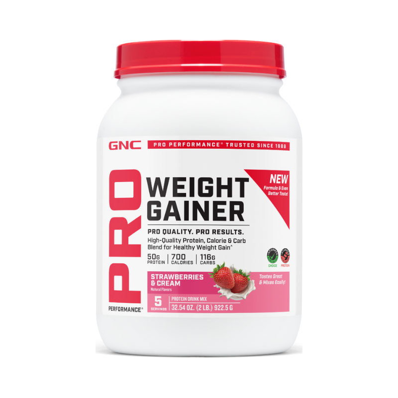 GNC Pro Performance weight gainer, Formula proteica pentru crestere in greutate, cu aroma de capsuni, testata antidoping Weight Gainer-ul Pro Performance cu aroma de capsuni este solutia perfecta pentru cei care doresc sa adauge masa musculara si sa isi creasca aportul caloric intr-un mod delicios. Fiecare portie contine 50g de proteine, combinate intr-o formula de proteine cu eliberare rapida si lenta – 80% proteine din zer si 20% proteine din cazeina micelara, pentru un aport constant de aminoacizi, esentiali in procesul de refacere si crestere musculara. Cu 700 de calorii pe portie, acest gainer este ideal pentru sportivii care doresc sa castige masa musculara rapid si eficient, oferindu-le atat energie pentru antrenamentele intense, cat si sustinerea necesara pentru recuperare. Continutul de carbohidrati si zaharuri este optimizat pentru a sprijini performanta, fara a adauga calorii inutile. GNC Pro Performance Weight Gainer se amesteca usor si are un gust delicios de capsuni, oferindu-ti o bautura cremoasa si placuta, perfecta de consumat dupa antrenament sau ca o gustare intre mese. De asemenea, este gluten-free, ceea ce il face o alegere sigura si curata pentru toti utilizatorii. Beneficii: · Cresterea masei musculare: 50g de proteine per portie ajuta la dezvoltarea si repararea fibrelor musculare; · Energie si recuperare: Caloriile si carbohidratii furnizeaza energia necesara pentru antrenamente intense si o recuperare rapida; · Mixabilitate superioara: Se amesteca usor in lichide, oferind o bautura cremoasa si placuta; · Aroma delicioasa: Gustul de capsuni face produsul mai placut si usor de consumat; · Fara gluten: Este ideal pentru persoanele cu sensibilitate la gluten; · Sustinerea obiectivelor de fitness: Formula echilibrata sprijina cresterea masei musculare si performanta sportiva. *Produsul este un supliment alimentar si nu trebuie sa inlocuiasca o dieta variata si echilibrata si un stil de viata sanatos.