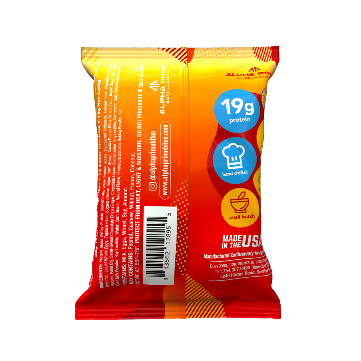 Alpha Prime® Prajitura Proteica cu Aroma de Aluat de Biscuiti Mod de adminitrare: a se consuma ca parte a unei diete echilibrate. Portie de servire: 1 prajitura (65 g) Portii per ambalaj: 1 Compozitie / portie de servire Cantitate %VNR Calorii 240 Total grasimi 11 g 14% Grasimi saturate 4 g 20% Grasimi trans 0 g Colesterol 40 mg 13% Sodiu 270 mg 12% Total carbohidrati 22 g 7% Fibre 2 g 7% Total zaharuri 11 g Zaharuri adaugate 6 g 8% Alcooli din zaharuri 7 g Proteine 19 g Vitamina D 0 mg 0% Calciu 78 mg 6% Fier 1.44 mg 8% Potasiu 188 mg 4% Ingrediente: amestec proteic (concentrat proteic din zer, izolat proteic din zer, colagen hidrolizat), faina de migdale, margarina vegetala lichida, eritritol, ou lichid intreg, fibre de tapioca, zaharuri (zahar brun, sirop de porumb), bucatele de biscuit (faina de grau, zahar brun, zahar, sorbitol, glicerina, ulei de palmier), bucatele de ciocolata semidulce (zahar, lichior de ciocolata, unt de cacao, lecitina de soia, amidon de porumb, sare, guma xantan), bicarbonat de sodiu, lapte praf semidegresat, lecitina de soia, apa, amidon de porumb, aroma naturala, sorbat de potasiu, praf de copt, sare. Contine: lapte, oua, grau, soia, migdale. Poate contine: arahide, caju, nuci, nuci pecan, nuca de cocos. Atentionari: nu utilizati daca sigiliul este rupt. Conditii de pastrare: a se pastra la 12-24° Celsius, ferit de caldura, lumina si umiditate. A se consuma, de preferinta, inainte de sfarsitul: vezi data mentionata pe ambalaj. Producator: Alpha Prime® Supps, LLC, SUA. Fabricat in: S.U.A.