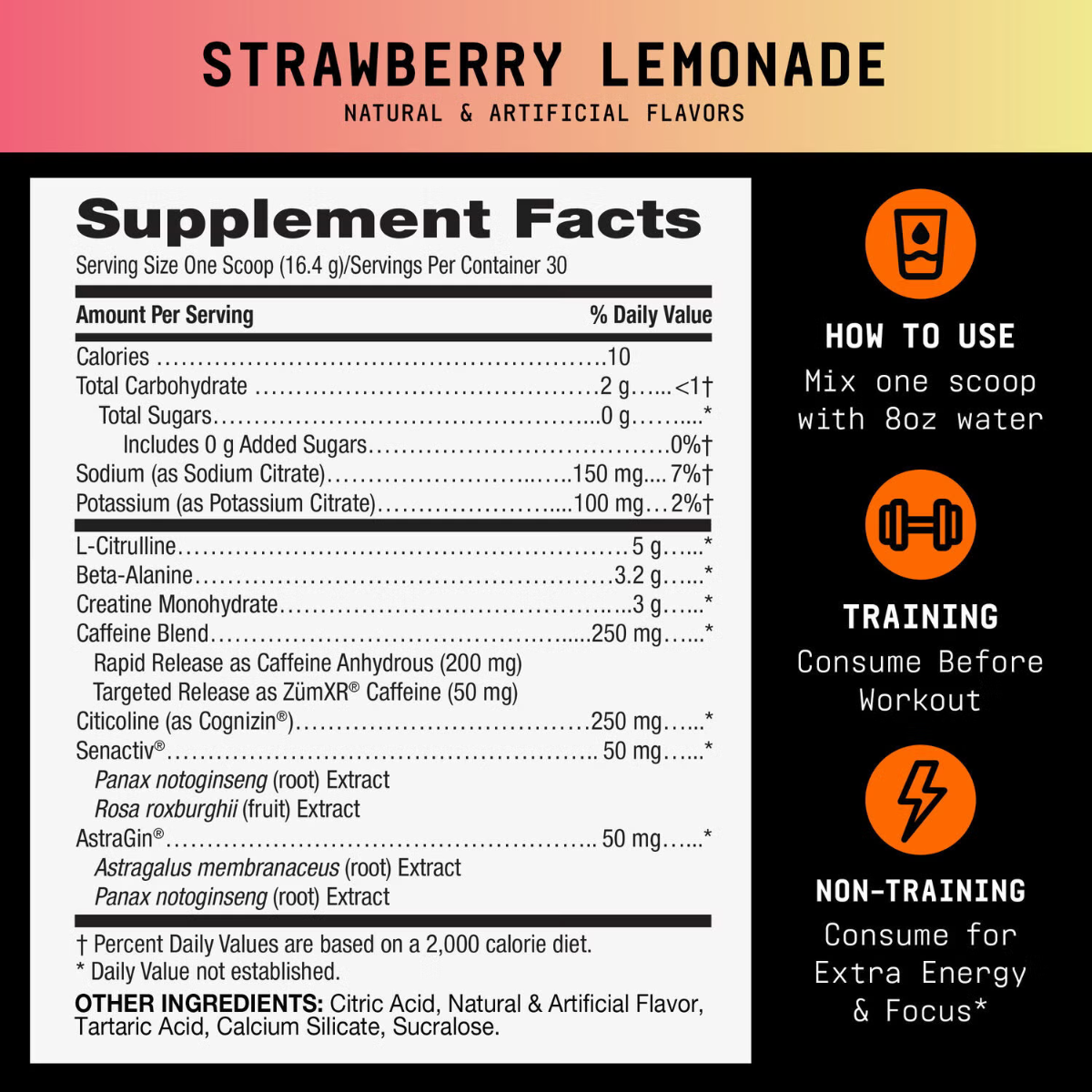 Beyond Raw® LIT V2 Pre-Workout With Strawberry Lemonade Flavor, pre-workout cu aroma de limonada de capsuni Mod de administrare: Ca supliment alimentar, amestecati 1 cupa cu 240 ml de apa rece si consumati inainte de antrenament. In zilele fara antrenament, consuma o portie pentru energie si concentrare suplimentara. Consuma cantitati suficiente de apa in timpul utilizarii acestui produs. Nu lua aproape de ora de culcare. Cantitate: 492 g | Portie de servire: 1 cupa (16.4 g) | Portii per recipient: 30 Compozitie / portie Cantitate %VNR Calorii 10 Carbohidrati 2 g 0.77%** Total zaharuri Zaharuri adaugate 0 g 0 g 0%** * Sodiu (citrat de sodiu) 150 mg * Potasiu (citrat de potasiu) 100 mg 5%** L-citrulina 5 g * Beta-Alanina 3.2 g * Creatina monohidrata 3 g * Amestec de cafeina Eliberare rapida sub forma de cofeina anhidra (200 mg) Eliberare sustinuta/tintita sub forma de cofeina ZumXR® (50 mg) 250 mg * Citicolina (Cognizin®) 250 mg * Senactiv® Extract de Panax notoginseng (radacina) Extract de Rosa roxburghii (fruct) 50 mg * AstraGin® Extract de Astragalus membranaceus (radacina) Extract de Panax notoginseng (radacina) 50 mg * *Valoarea nutritionala de referinta nu a fost stabilita. **Valoarea nutritionala de referinta, conform Reg. UE nr. 1169/2011. Alte ingrediente: L-citrulina, beta-alanina, creatina monohidrata, amestec de cafeina, citicolina, sodiu, potasiu, Senactiv®, AstraGin®, arome naturale si artificiale, acid citric, acid tartric, silicat de calciu, sucraloza. Produsul contine 250 mg de cafeina. Atentionari: Produsul este un supliment alimentar si nu trebuie sa inlocuiasca o dieta variata si echilibrata si un stil de viata sanatos. A nu se depasi doza recomandata pentru consumul zilnic. A nu se lasa la indemana si la vederea copiilor. Consulta-ti medicul inainte de a folosi acest produs daca esti insarcinata, alaptezi, iei medicamente, ai sub 18 ani sau ai o afectiune medicala. Opreste utilizarea cu doua saptamani inainte de interventii chirurgicale. Produsul este destinat exclusiv adultilor. Utilizarea acestui produs poate provoca senzatii de furnicaturi si inrosire a pielii. Aceste senzatii pot fi mai intense daca produsul este consumat inainte sau in timpul exercitiilor fizice. Produsul poate suferi decantari. Produsul se vinde in functie de greutate si nu de volum. Nu contine: gluten, zahar. Conditii de pastrare: In ambalajul original, la loc uscat, la temperatura camerei. Producator: General Nutrition Corp. Pittsburgh, PA 15222, USA Fabricat in: SUA