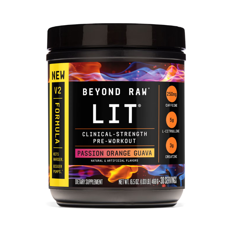 Beyond Raw® lit v2 pre-workout with passion orange guava flavor, Pre-Workout cu aroma de passion orange guava Descopera Beyond Raw LIT V2 Pre-Workout cu aroma de passion orange guava, formula avansata care duce performanta la nivelul urmator. Fiecare portie combina ingrediente de ultima generatie pentru energie, focus, rezistenta si pompare musculara maxima, cu zero zahar si fara gluten. Beyond Raw LIT V2 Pre-Workout este alegerea perfecta pentru sportivii care vor sa depaseasca limitele performantei lor. Beneficii: Energie intensa si focus mental: 250 mg cafeina, inclusiv cafeina anhidra cu eliberare rapida si ZumXR® pentru energie sustinuta si claritate mentala; Rezistenta si performanta musculara: Senactiv® imbunatateste performanta in timpul exercitiilor intense si creste timpul pana la epuizare; Hidratare optima: 250 mg electroliti pentru a mentine hidratarea si a sustine sesiuni mai lungi de antrenament; Citocolina (Cognizin®), in timpul antrenamentelor intense, poate imbunatati claritatea mentala si capacitatea de concentrare asupra exercitiilor; Suport pentru muschi si pompare maxima: 3 g creatina monohidrat pentru forta si constructie musculara, 5 g L-citrulina pentru pompe impresionante si 3.2 g beta-alanina pentru reducerea acidului lactic si mai multe repetari; Aroma delicioasa de passion orange guava: transforma fiecare antrenament intr-o experienta placuta; Formula fara zahar si gluten. *Produsul este un supliment alimentar si nu trebuie sa inlocuiasca o dieta variata si echilibrata si un stil de viata sanatos. A nu se lasa la indemana copiilor. A nu se depasi doza recomandata zilnic.