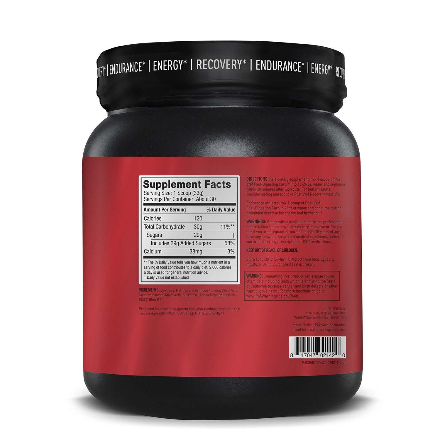 JYM® POST JYM® Fast Digesting Carbs, Carbohidrati cu Digestie Rapida, Dextroza Mod de administrare: ca supliment alimentar, amestecati 1 cupa de POST JYM Fast-Digesting Carb™ cu 480-720 ml de apa si consumati cu 30 de minute dupa antrenament. Pentru cele mai bune rezultate, adaugati o cupa de POST JYM Recovery Matrix®. Cantitate neta: 990 g | Portie de servire: 1 cupa (33 g) | Portii per recipient: aprox 30 Compozitie / portie de servire Cantitate %VNR Calorii 120 Total grasimi 0 g 0%** Acizi grasi 0 g 0%** Total carbohidrati 30 g 11.54%** Zaharuri 29 g 32.22%** Zaharuri adaugate 29 g * Calciu 30 mg 3.75%** *Valoarea nutritionala de referinta nu a fost stabilita. **Valoarea nutritionala de referinta, conform Reg. UE nr. 1169/2011. Ingrediente: Calciu, dextroza, arome naturale si artificiale, acid citric, silicat de calciu, acid malic, sucraloza, acesulfam de potasiu, colorant albastru #1. Produsul a fost procesat intr-o unitate in care se produc alimente care conțin oua, lapte, soia, alune de padure. Recomandare pentru atletii de anduranta: amestecati 1 cupa de POST JYM Carbohidrati pentru digestie rapida cu 720 ml de apa si consumati in timpul exercitiilor pentru energie si hidratare. Atentionari: Consultati un medic specialist inainte de a utiliza acest produs sau orice alt supliment alimentar. Nu utilizati daca sunteti insarcinata sau alaptati, daca aveti sub 18 ani, daca aveti sau suspectati ca aveti o afectiune medicala, si/sau daca administrati medicamente cu sau fara prescriptie medicala. Produsul este un supliment alimentar si nu trebuie sa inlocuiasca o dieta variata si echilibrata si un stil de viata sanatos. A nu se depasi doza recomandata pentru consumul zilnic. A nu se lasa la indemana si la vederea copiilor. Nu utilizati daca sigiliul este rupt sau lipseste. Conditii de pastrare: In ambalajul original, la loc uscat si racoros, la o temperatura cuprinsa intre 15-30°C. Protejati de caldura, lumina si umiditate. A se consuma, de preferinta, inainte de sfarsitul: Data de expirare este exprimata in formatul MM/DD/YYYY (luna/zi/an). Va rugam sa verificati cu atentie interpretarea corecta. Producator: PHD Fitness, 31300 Via Colinas #101, Westlake Village, CA, 91362, SUA. Fabricat in: SUA